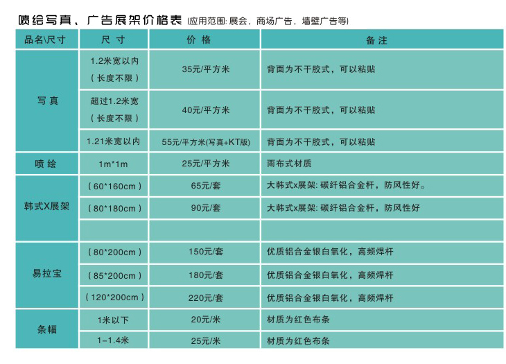 客户需提供可印刷电子文件,如需写真喷绘设计,每款设计费100元;写真喷绘制作可选择亮膜、亚膜、装裱KT板等。